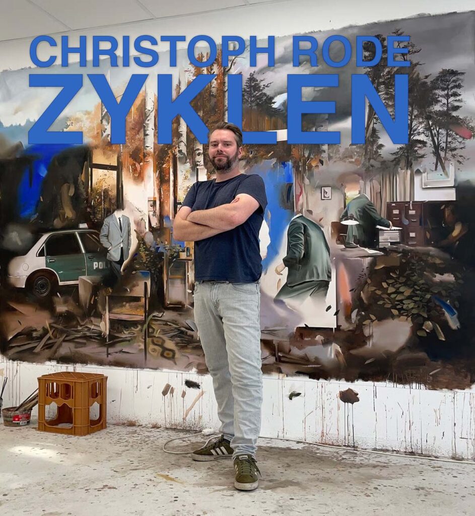 Christoph Rodes großformatige Raum- und Landschaftsbilder öffnen Räume, die an surreale Bühneninstallationen erinnern. Tagtägliches und Momentaufnahmen verschmelzen mit traumhaften Fragmenten, so dass nichts so sein muss, wie es scheint. Identifikation bleibt möglich, doch zugleich bleibt Vieles individuell auslegbar. In diesen Bildern stehen Geste, Situation und Prozess im Vordergrund – nicht zuletzt durch Farbigkeit und Komposition.